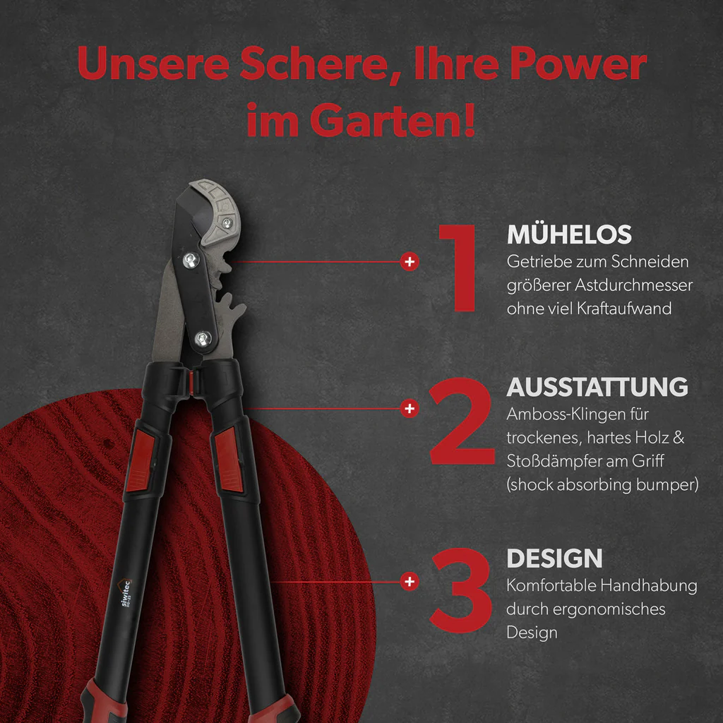 - Getriebe zum Schneiden größerer Astdurchmesser ohne viel Kraftaufwand